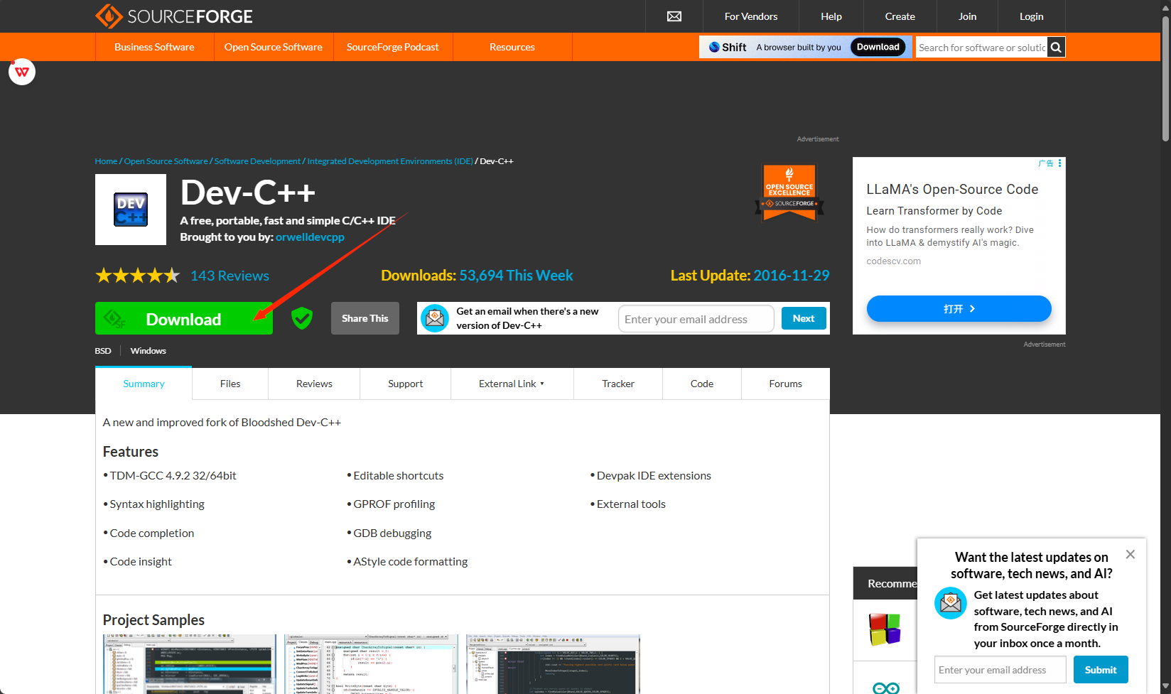 访问下载网站https://sourceforge.net/projects/orwelldevcpp/下载好安装包