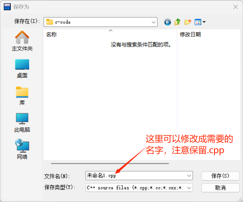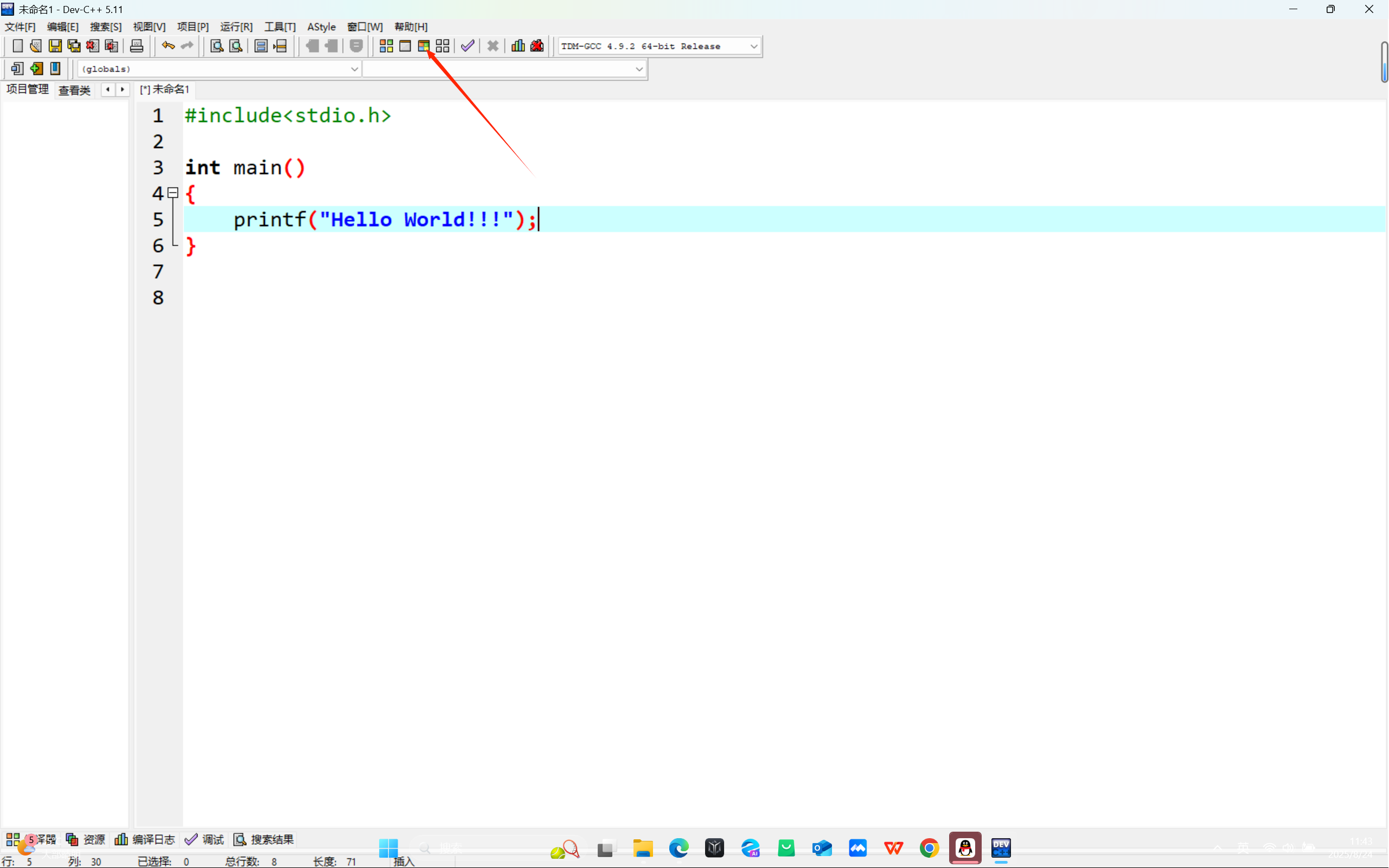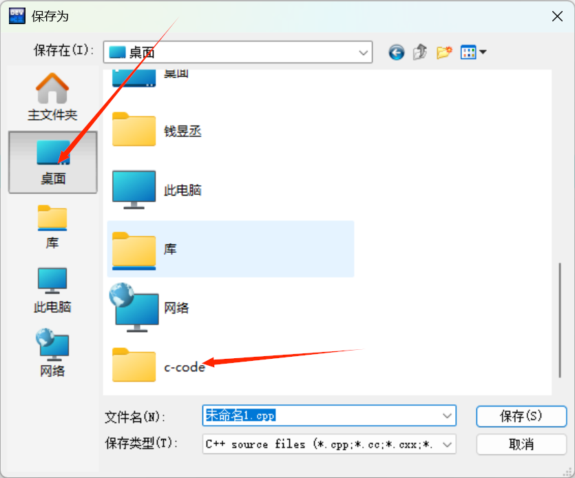 写好后点击这个(编译并运行),第一次会让我们选择一个路径来保存代码,推荐大家在桌面或者其他地方单独建立一个文件夹,名字可以叫(c-code)专门存自己写的C语言代码,方便保存。