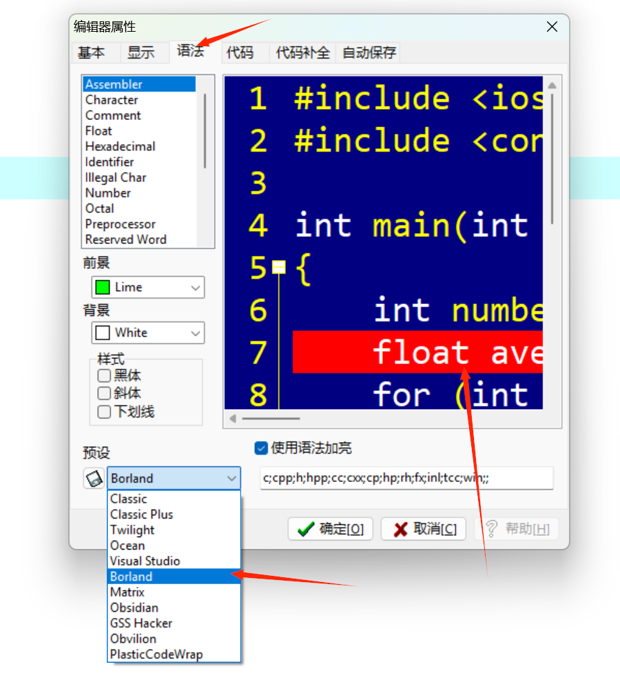 选择语法,在下面的预设里面可以调,右边可以看到效果。