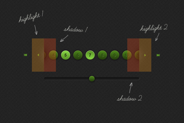 看看下面的图片。 在其中,您将看到我们需要四个图像来处理每个高光和阴影。 高光除了位于容器两侧的控件之外,还属于容器本身的阴影,因此我们需要将其设置为110px高。