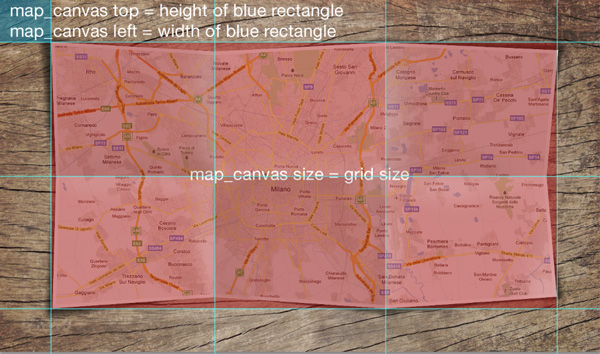 其余CSS并不是特别令人兴奋。 它只是将地图和遮罩放置在正确的位置。 map_canvas设置为1202px宽和622px高,因为它恰好是包含地图的网格的大小(图片中的红色矩形),top:97px和left:97px是该网格距顶部的偏移量左上角(图片中的蓝色矩形)。