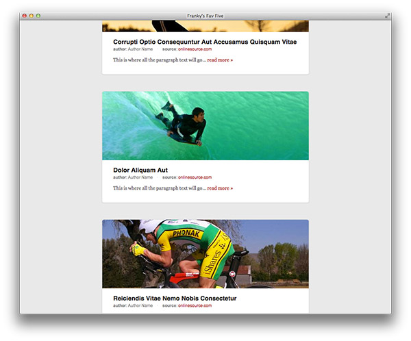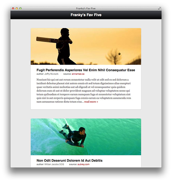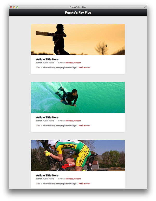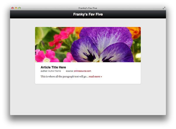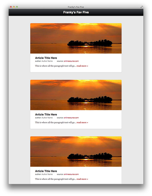 让我们尝试通过创建设计模型,将到目前为止介绍的内容付诸实践。 为了简单起见,让我们想象一下,我们的任务是创建一个基本的网站设计,该网站设计展示了整个网络上某人最喜欢的文章的摘录。 我们称这个人为Franky,我们将其设计为“ Franky's Fav Five”。