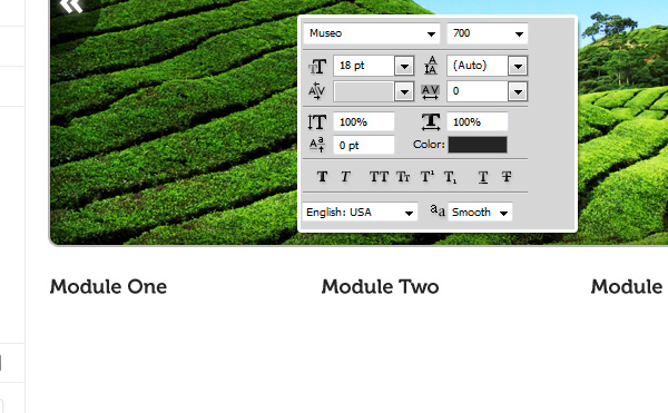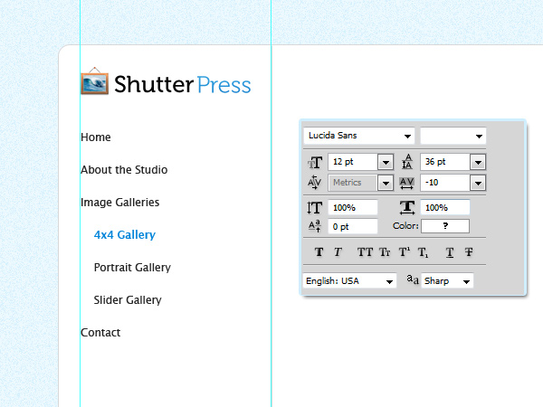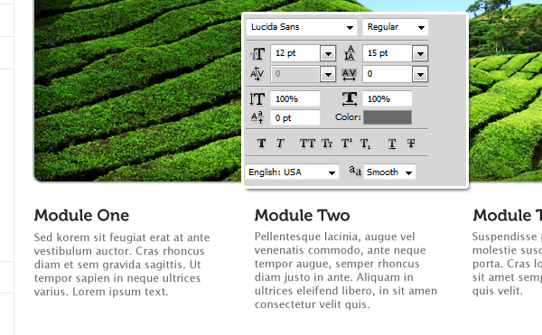 为此,我将使用一种简单的字体-Lucida Sans ,字体为12pt , 首字符设置为36pt ,黑色颜色为#252525 。 我碰巧更喜欢在Photoshop样机中为网络字体使用Sharp消除锯齿设置,但是您可以使用任何想要的设置。