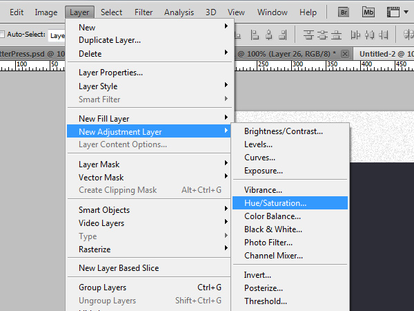 最后,让我们在其他两个图层上添加一个新的调整图层(“ 图层”>“新的调整图层”>“色相/饱和度” ),以使我们的噪声不会让旧的灰色变淡。