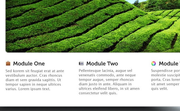 添加描述性文本:接下来是每个模块的描述性文本。 我们将在此处使用基本的Lorem Ipsum脚本,但是您可能希望使用一些实际的文本来测试最适合您的行高和字体大小。 这是演示的呈现形式: