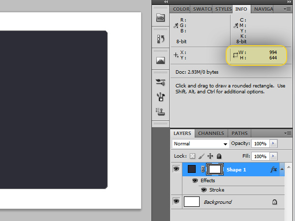 绘制圆角矩形:现在,我们确定容器尺寸为994px x 644px ,继续绘制该尺寸的圆角矩形(使用12px半径 )。 打开“信息”面板(“ 窗口”>“信息”或F8 )以在绘制矩形时查看其大小。