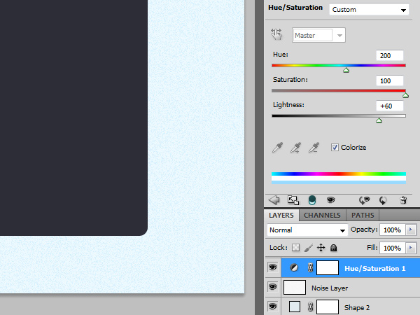 在调整层的“调整”面板(“ 窗口”>“调整” )下,我使用了( 色相:200,饱和度:100和亮度:+60 )的设置,并选中了“着色”框。 您可以玩直到获得自己想要的效果。
