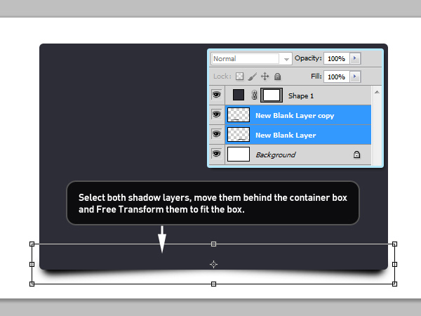 将两个阴影层都移动到“框架”层的后面并缩放它们(选择两个层并按Ctrl + T),以使它们恰好位于框架矩形的总宽度之内。
