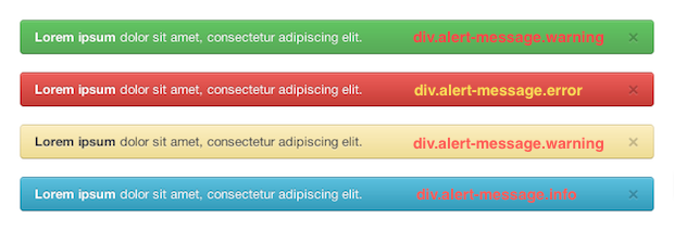 警报栏在外观上与按钮非常相似,尽管它们的构造不同。 每个错误消息都是带有alert-message类的<div>标记。 有四种不同类型的消息,每种消息都必须添加相应的类: