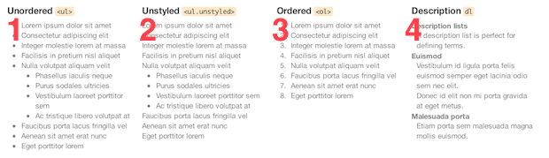 列表是Bootstrap涵盖的另一种版式范围,并且具有四组不同的样式:项目符号列表,嵌套项目符号列表,有序列表和词汇表。 同样,它们并不难使用,因为它们没有偏离HTML的标准。 因为列表可以用不同的方式构造,所以这里快速回顾一下如何在Bootstrap样式中使用它们。