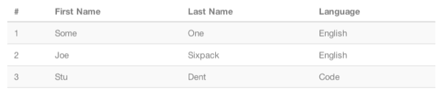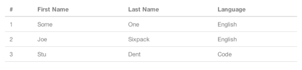 Bootstrap是一个工具包,部分地面向新的Web设计人员,因此不必说这些东西不是用于布局的。 相反,表是用于表格数据的,并且Bootstrap可以很好地利用其样式美化表格数据,而无需任何其他类或属性。 例如,我们可以看一下将生成表HTML的常规代码段。