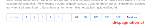 现在,我们转到分页,它是无功能的(例如标签和药丸),但仍在Bootstrap中设置样式。 Bootstrap在与分页按钮相同的选项卡上处理分页按钮,该列表这次与pagination类一起包装在<div> 。 除了为上一个/下一个链接保留的第一个和最后一个项目之外,每个列表项中都可以有一个链接号(或省略号)。 这些都将prev和next班,分别。