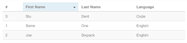 最后,通过添加一小段jQuery,但除了将sortTableExample作为<table>标记的ID添加之外,对HTML没有任何更改,您可以在单击列标题时添加排序功能。 此功能需要Tablesorter 2.0 jQuery插件, 可免费下载 。 正如您可能已经猜到的那样,您还需要调用jQuery才能使其正常工作。