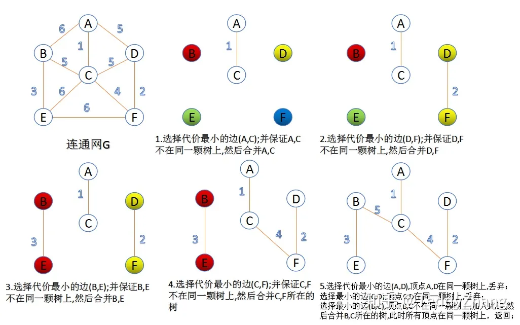 Kruskal算法是一种贪心算法,我们将图中的每个edge按照权重大小进行排序,每次从边集中取出权重最小且两个顶点都不在同一个集合的边加入生成树中!注意:如果这两个顶点都在同一集合内,说明已经通过其他边相连,因此如果将这个边添加到生成树中,那么就会形成环!这样反复做,直到所有的节点都连接成功!