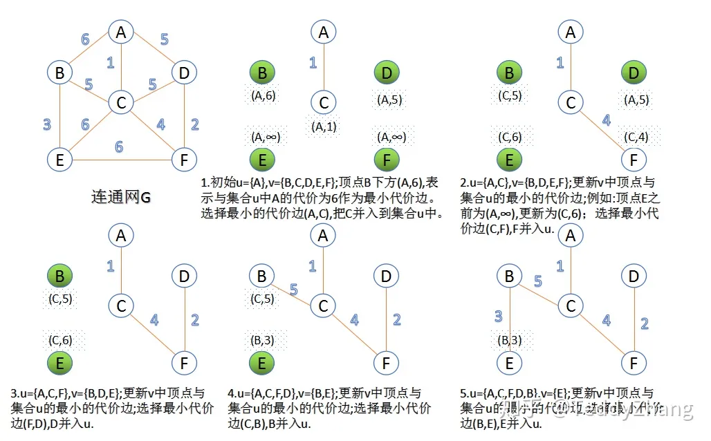 Prim算法是另一种贪心算法,和Kuskral算法的贪心策略不同,Kuskral算法主要对边进行操作,而Prim算法则是对节点进行操作,每次遍历添加一个点,这时候我们就不需要使用并查集了。具体步骤为:
