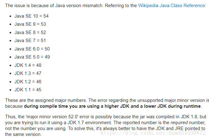 通过stackoverflow上找到了(笔者及其喜欢这个网站,几乎啥问题都有过先例,并且有解答,这个主要是java版本不匹配,在编译的时候使用的是高版本的jdk,而运行时是低版本的jdk)