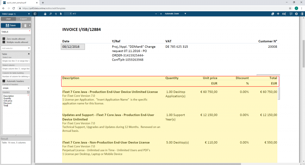 同时,IText提供了一个框架,根据您在模板中定义的选择规则,智能地识别PDF文档中的数据。这与基于人工智能的替代方案相比具有显著的优势,后者需要大量的培训来识别文档: