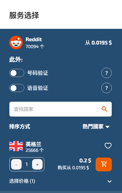 - 在目录中选择 “Reddit” 该服务,然后选择号码需要的国家(想注册美国账户就选择美国号码)。