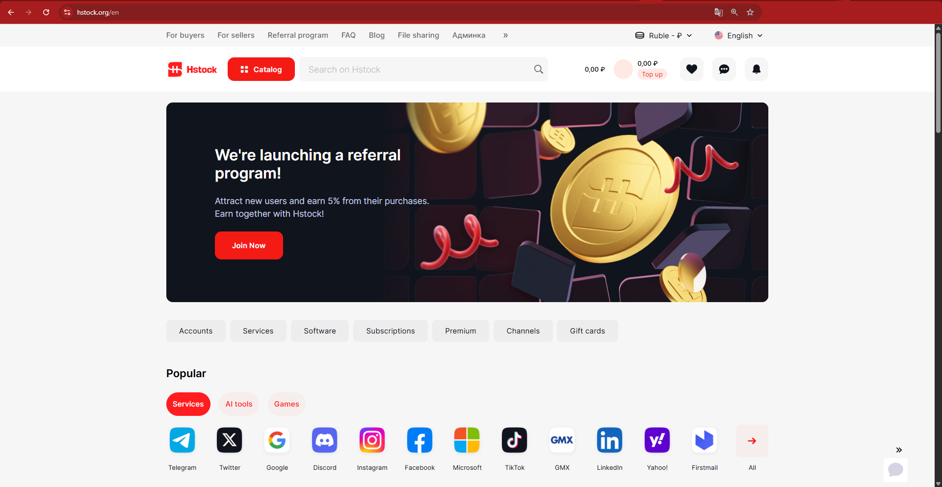 Hstock 平台 汇聚了经过验证的卖家,因此购物既安全又快速。超过 80 个商品类别满足各种需求:成品账户、订阅、软件、游戏、优惠码,以及线上工作和娱乐所需的一切。