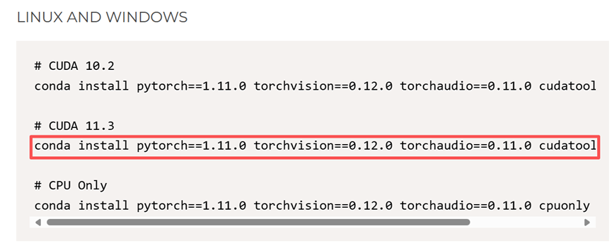 3. 安装Pytorch和Torchvision。首先查看电脑的CUDA版本,参考这篇博文。根据CUDA版本,到Pytorch官网选择合适的版本,复制其安装命令,在命令行执行该命令。