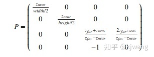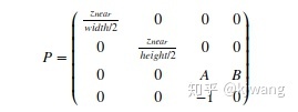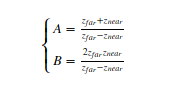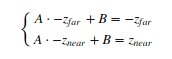 得到zproj=(A⋅z+B)/z,或A⋅z+B=z⋅zproj 将远平面和近平面z坐标代入上式得(注意注意:在这里,视景体内的深度坐标投影之后,有zproj∈[−1,1]):