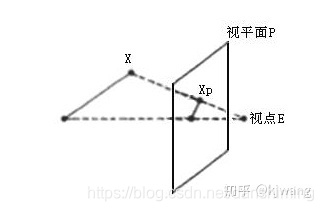 假设三维世界中有一条经过X点的射线R,X和视点的连线在视平面(也是投影平面)上的交点是Xp,那么Xp即为X点在视平面上的投影.那么射线R上的所有点都可以依照上面的方法在投影平面上找到对应的一点Xp,所有的Xp点就构成了射线R的透视投影后的射线Rp.无论三维模型多复杂,投影的方法都是一样的,如下图:
