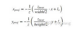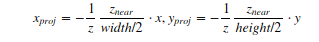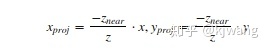 第二步:为使视景体内的顶点投影到近平面上,其坐标映射到[-1.0, 1.0]范围内,投影后的点要分别除以width / 2和height / 2,其中width,height分别为近投影平面的宽度与高度,根据第一步结果,有:
