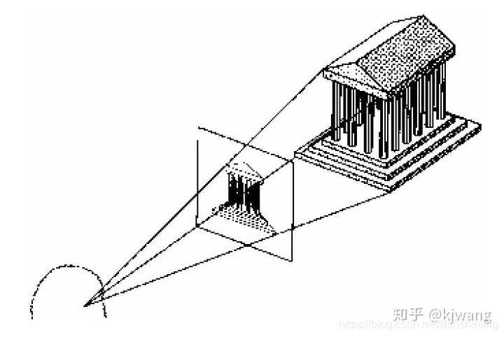 首先要想透视投影成立,需要三个因素:观察者\投影平面\被投影三维物体.三者关系是:假设人眼即为观察者,我们观察的是三维模型在投影平面上的投影,可以用图来表示: