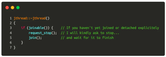 第二个特征jthread是帮助我们解决std::thread以前导致的困境:join或detach*。现在jthread来承担一些责任。它的析构函数简单地实现为: