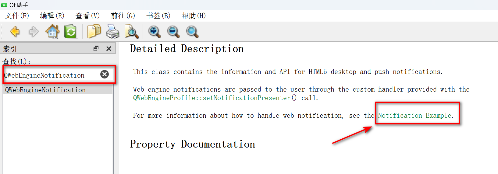 在Qt Assistant索引页的查找框输入QWebEngineNotification,在对该类的详细描述中,可以找到Qt官方对该工程的详细说明,如下: