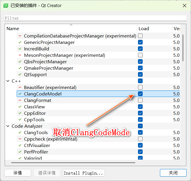在菜单栏选择“帮助”->“关于插件”子菜单,弹出如下对话框,取消勾选ClangCodeMode