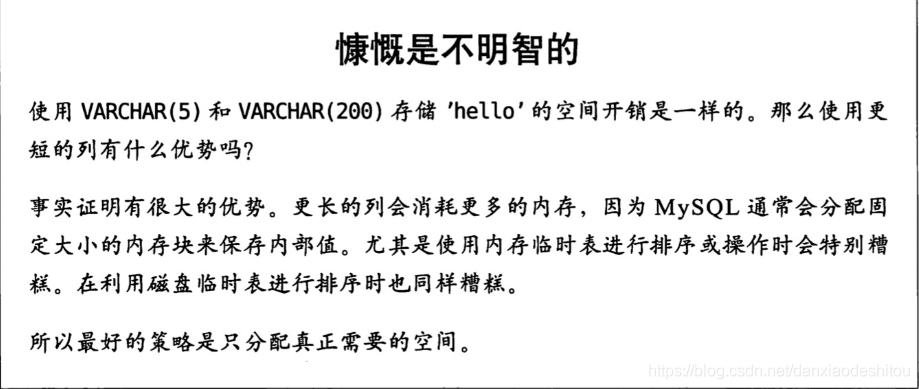 varchar是可变长字符串,不预先分配存储空间,只指定需要的长度,如果存储长度大于5000,定义字段类型为 text,独立出来一张表,用主键来对应,避免影响其它字段索引效率。