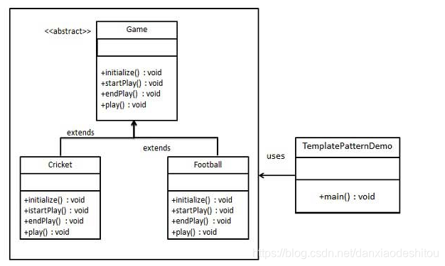 在模板模式(Template Pattern)中,一个抽象类公开定义了执行它的方法的方式/模板。它的子类可以按需要重写方法实现,但调用将以抽象类中定义的方式进行。这种类型的设计模式属于行为型模式。图例如下: