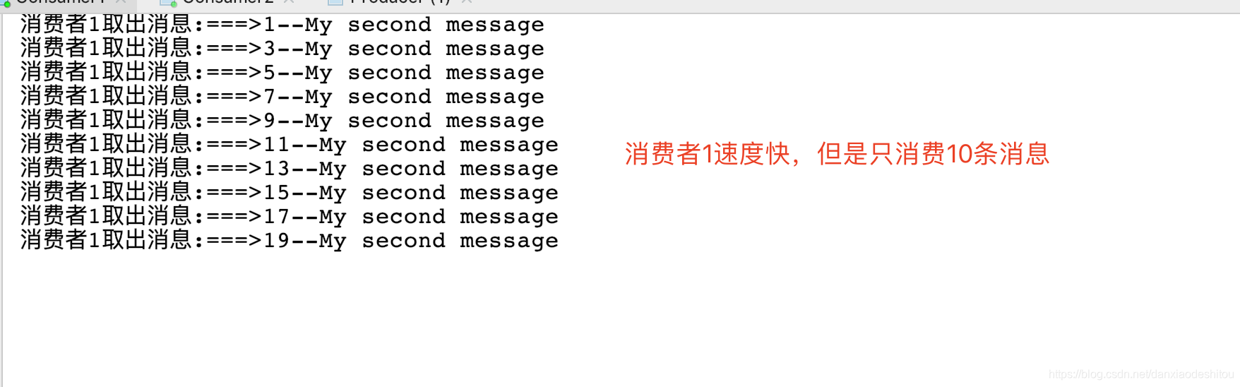 可以看到情况同上,虽然channel每次从队列中获取一个消息,但是一旦获取之后自动ack,则消费者1 和消费者2 有同样的竞争机会。
