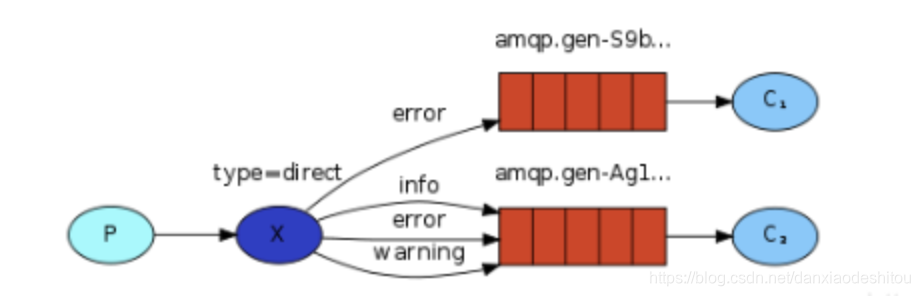 C2:消费者,其所在队列指定了需要routing key 为 info、error、warning 的消息