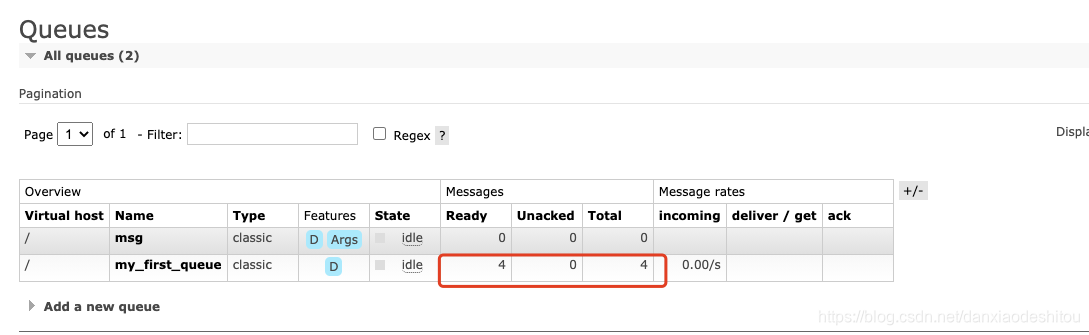 - queue:消息队列,图中红色部分。类似一个邮箱,可以缓存消息;生产者向其中投递消息,消费者从其中取出消息