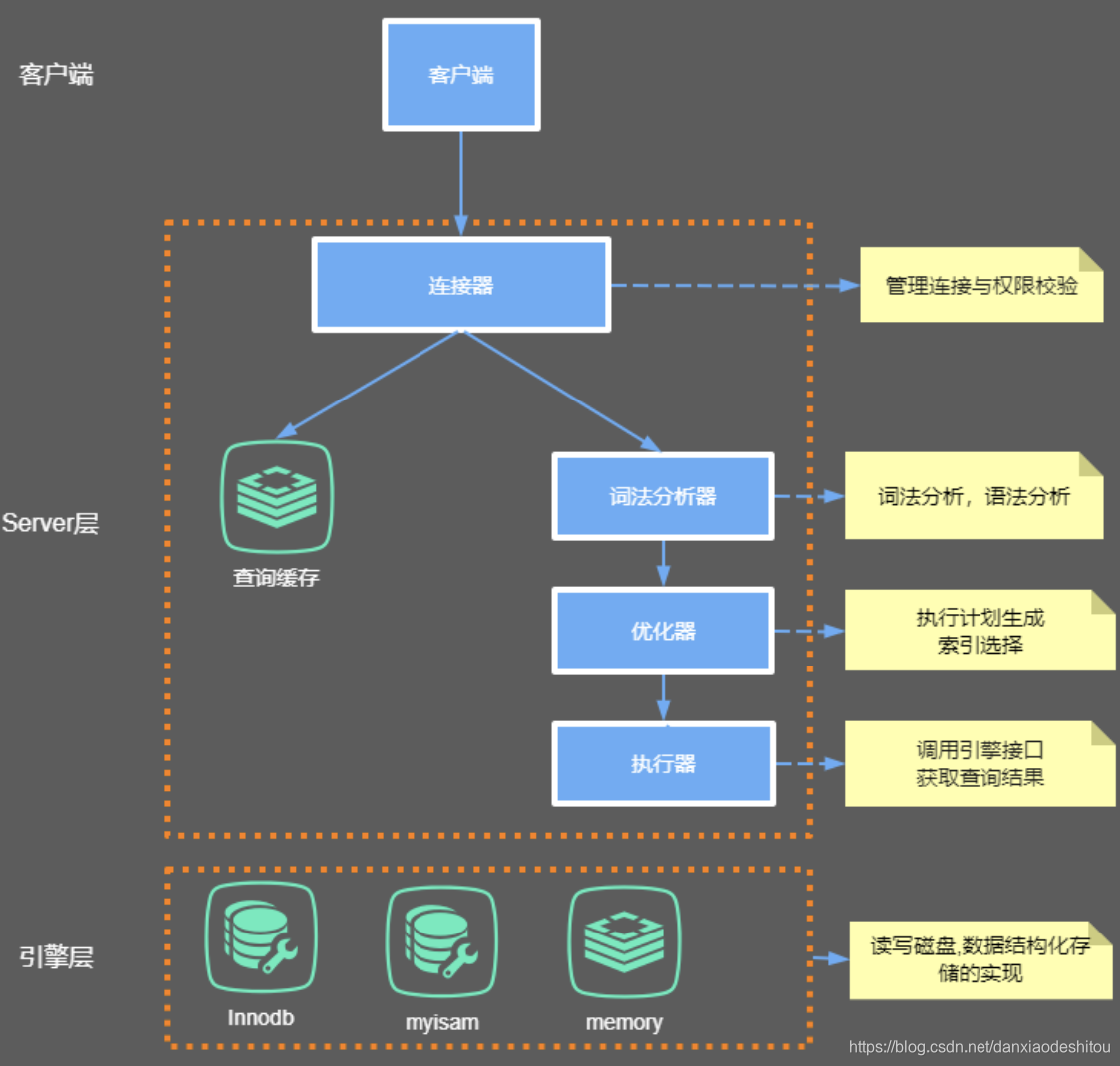 主要包括连接器、查询缓存、分析器、优化器、执行器等,涵盖 MySQL 的大多数核心服务功能,以及所有的内置函数(如日期、时间、数学和加密函数等),所有跨存储引擎的功能都在这一层实现,比如存储过程、触发器、视图等。