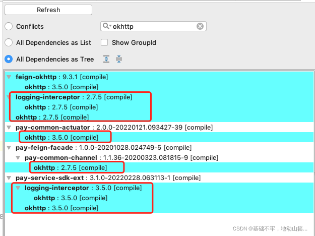 从上图可以看出,父pom提供了两个版本okhttp,而子pom显式的声明引用okhttp老版本,而其他的工具包,诸如pay-service-sdk-ext都间接的引用了okhttp3,所以造成了jar包冲突,这里最简单的处理方式,将子pom中的引用统一升到okhttp3版本即可,如下图所示