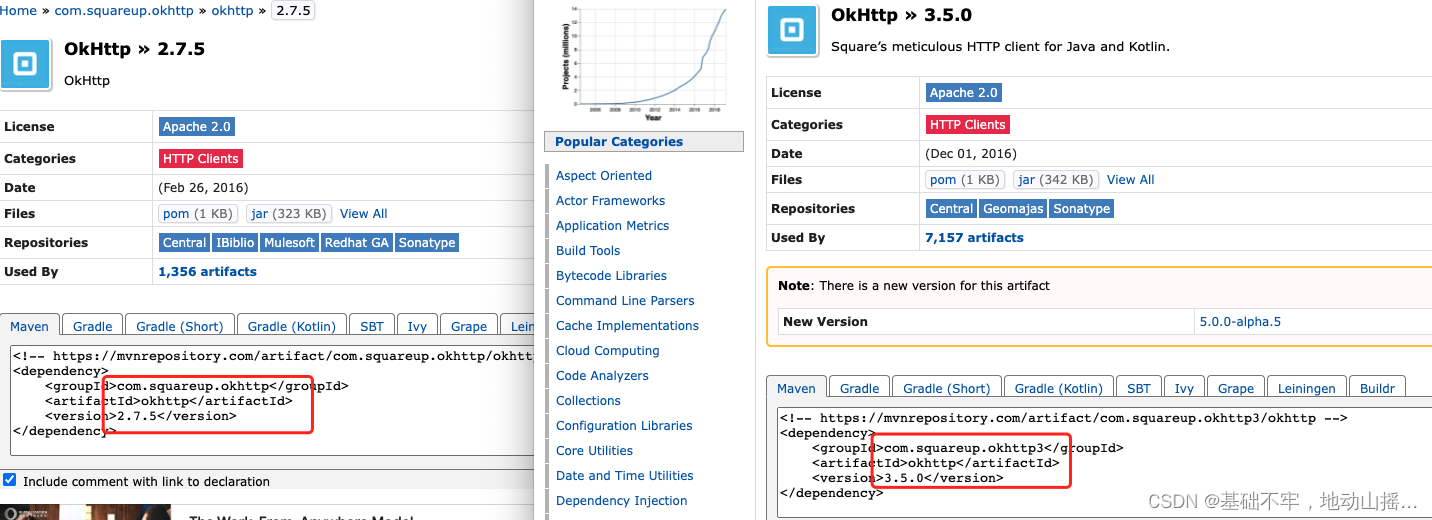 从上图可以发现,既有okhttp2.7.5版本的,又有3.5.0版本,登录到maven中央仓库,