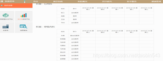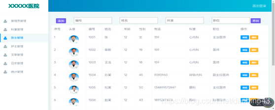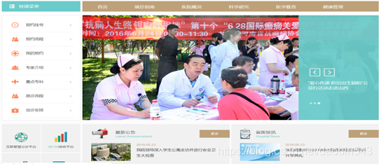 系统页面主框架和系统页面都是采用bootstrap框架搭建和编写。布局简洁明了,顶部导航栏,左侧菜单功能加上右侧的轮播新闻。下方为主要名流医生信息展示。