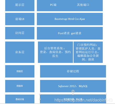本系统架构包含展示层,前端UI,访问层,业务层,数据层,数据库,基础设施。其中展示层包括PC与其他端口,其作是为用户和系统的交互架起桥梁。访问层作用是保障程序访问数据库,业务层顾名思义负责预约挂号系统的业务接口功能。因此,系统总体采用多层架构和MVC。[12]