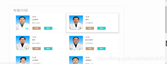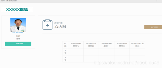 科室医生展示界面用于展示该科室值班医生,并可进行医生信息查看,预约如图4-7所示: