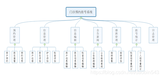 系统根据需求分析设计出七个业务功能模块,分别是预约管理、信息管理、公告日志、排班管理、信息编辑、挂号流量统计、日志管理,门诊预约功能设计如图4-2所示: