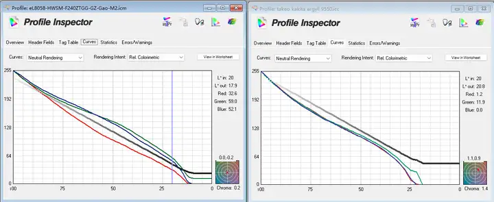 左边既神秘墨水在L8058上做的校色、右边为爱普生原装墨水在P9550上做的校色