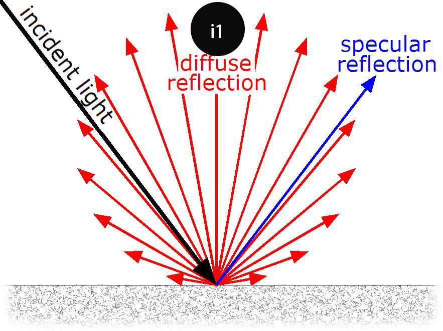 通常光度计的光路设计是45°/0°。黑色是入射光,红色光线是漫反射,蓝色光线是镜面反射,在0度位置,既黑色圆球方向接收光线就可以避免镜面反射。前提是反射界面是平的。如果反射界面是凹凸不平的,就有可能会有镜面反射被射进光度计,而m3偏振镜对光源起偏,接收处也有偏振镜过滤镜面反射。