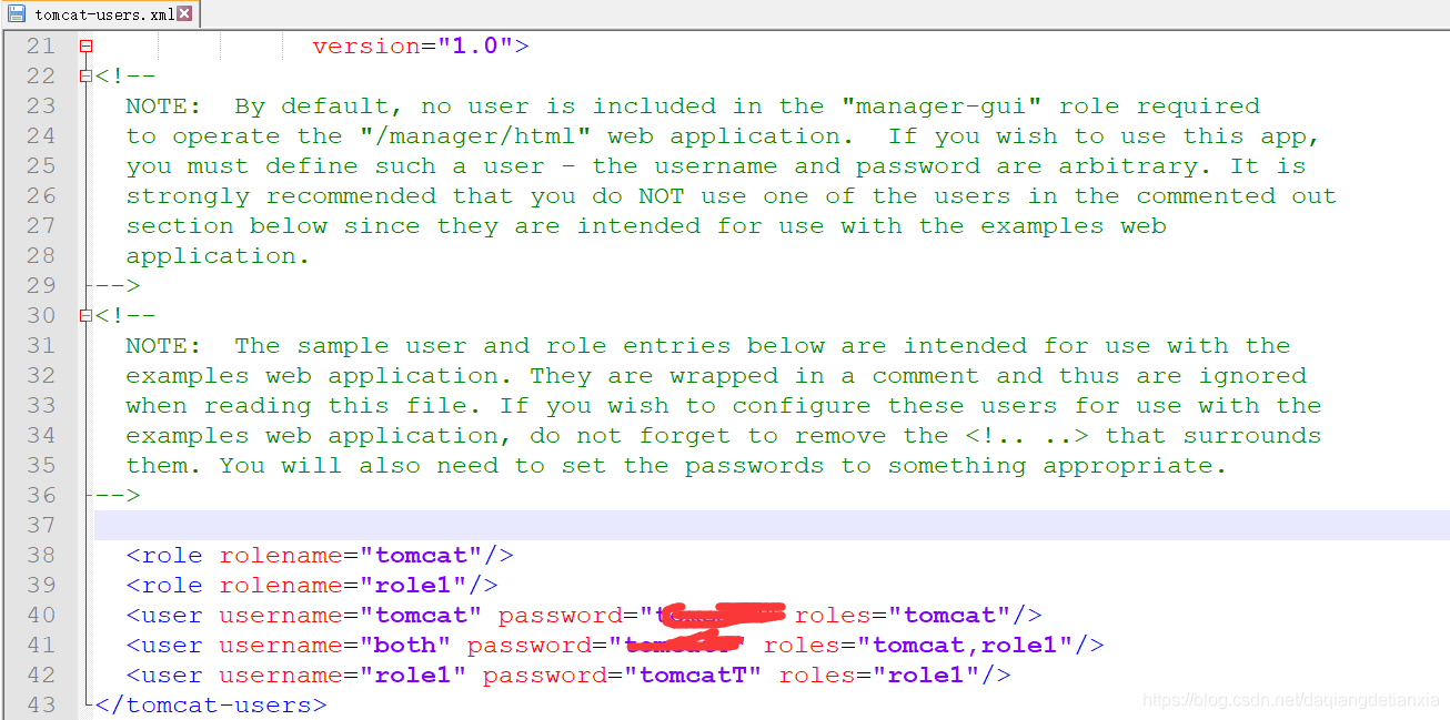 打开 D:/tomcat/conf/ 目录下的 tomcat-users.xml