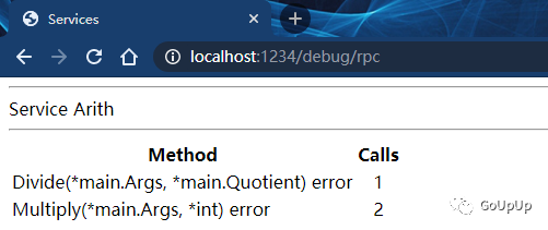 细心的朋友可能发现了,除了默认的路径/_goRPC_用来处理 RPC 请求,rpc.HandleHTTP()方法还注册了一个调试路径/debug/rpc。我们可以直接在浏览器中访问这个网址(需要服务端程序开启。如果服务端在远程,需要相应地修改地址)localhost:1234,直观的查看各个方法的调用情况: