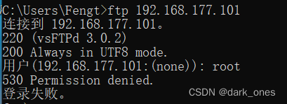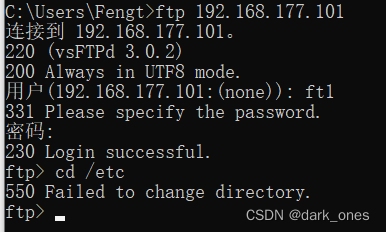 7.ftp 192.168.177.101 建立ftp连接 ip为虚拟机主机IP