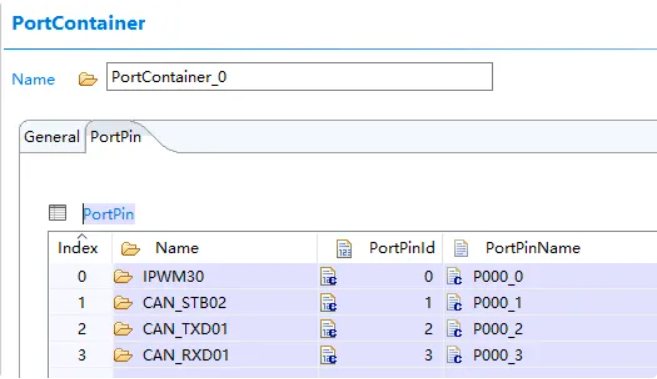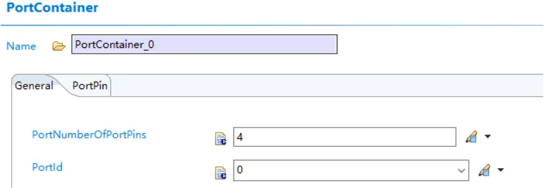 PortContainer配置PortContainer中包含该Port口配置的若干引脚。Port本身具有两个属性:PortNumberOfPortPins :本Port中配置的引脚数。