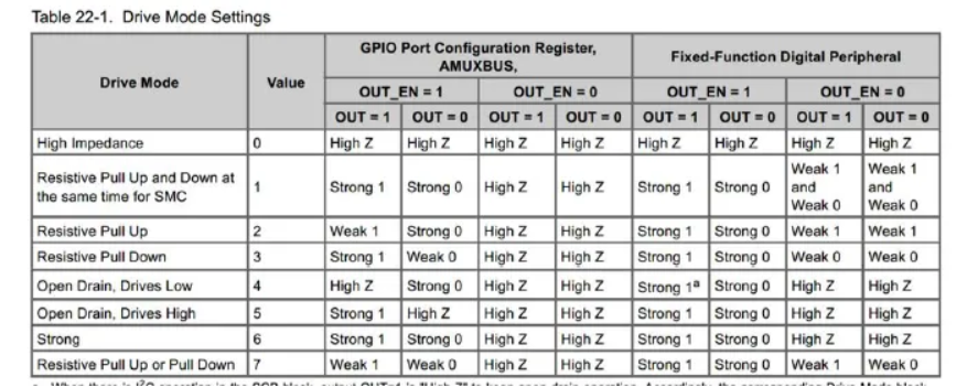 PortPinOutputDrive:驱动模式,大部分情况可配置为STRONG。具体可参考表格:
